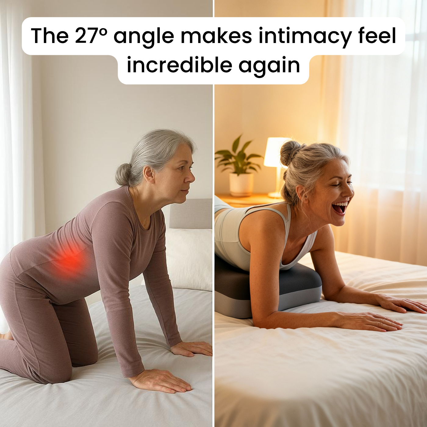 The Deep Wedge is precision-engineered at 27° - the exact angle that removes strain and improves positioning for couples over 50. When physical discomfort is eliminated, natural desire often returns. This isn't a trick or technique—it's biomechanical support that addresses the real physical changes our bodies go through after decades of desk jobs and aging.
